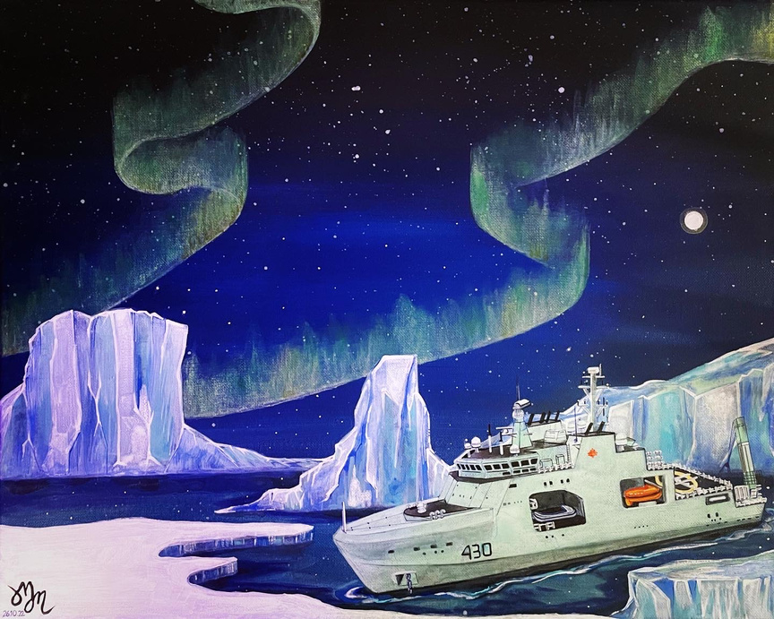 HMCS Harry De Wolf Arctic and Offshore Patrol vessel in the Arctic circle of Canada amidst northern lights and icebergs.